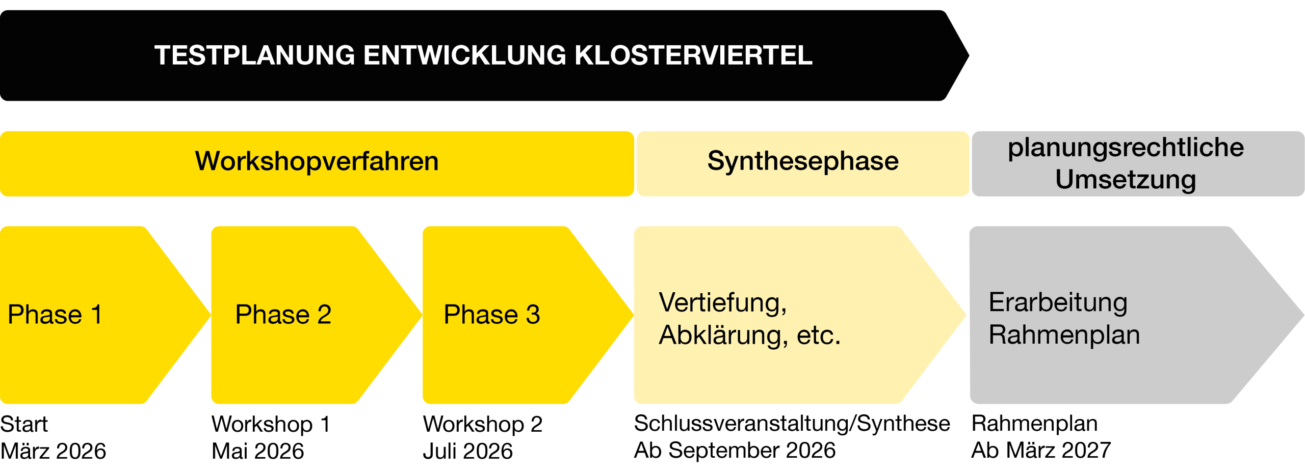 Um die Nutzungs- und Entwicklungsperspektiven ausloten zu können, wird ab März 2026 ein Testplanungsverfahren durchgeführt. Im Rahmen dieser Testplanung entwickeln und vertiefen drei interdisziplinäre Planungsteams mögliche Ideen und Entwicklungsvarianten. Die Zwischen- und Schlussresultate werden an Fachworkshops diskutiert, ergänzt und weiterentwickelt.